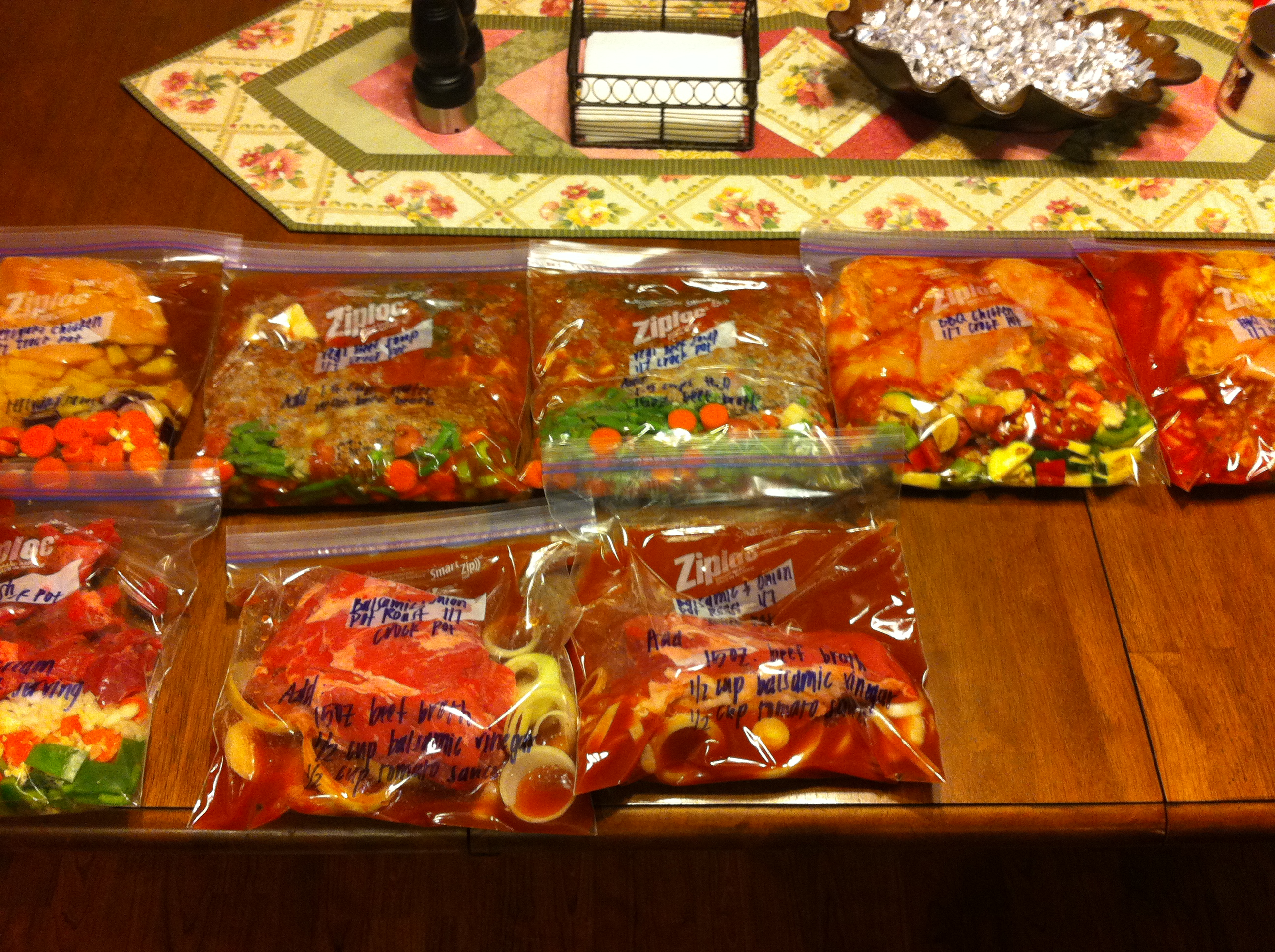 Pretty impressive, isn’t it? In total, it took me about an hour and a half from start to finish – not bad to have ten ready-made meals! I wrote on each bag the name of the meal, that it was meant for the crock pot, today’s date, and anything that needed to be added in the day of (more broth, water, etc). I’ll post the recipes as I try them… I don’t like to post them on here until I can give an honest review. Everything looked and smelled good though! If you want to see her blog, complete with recipes, click here!