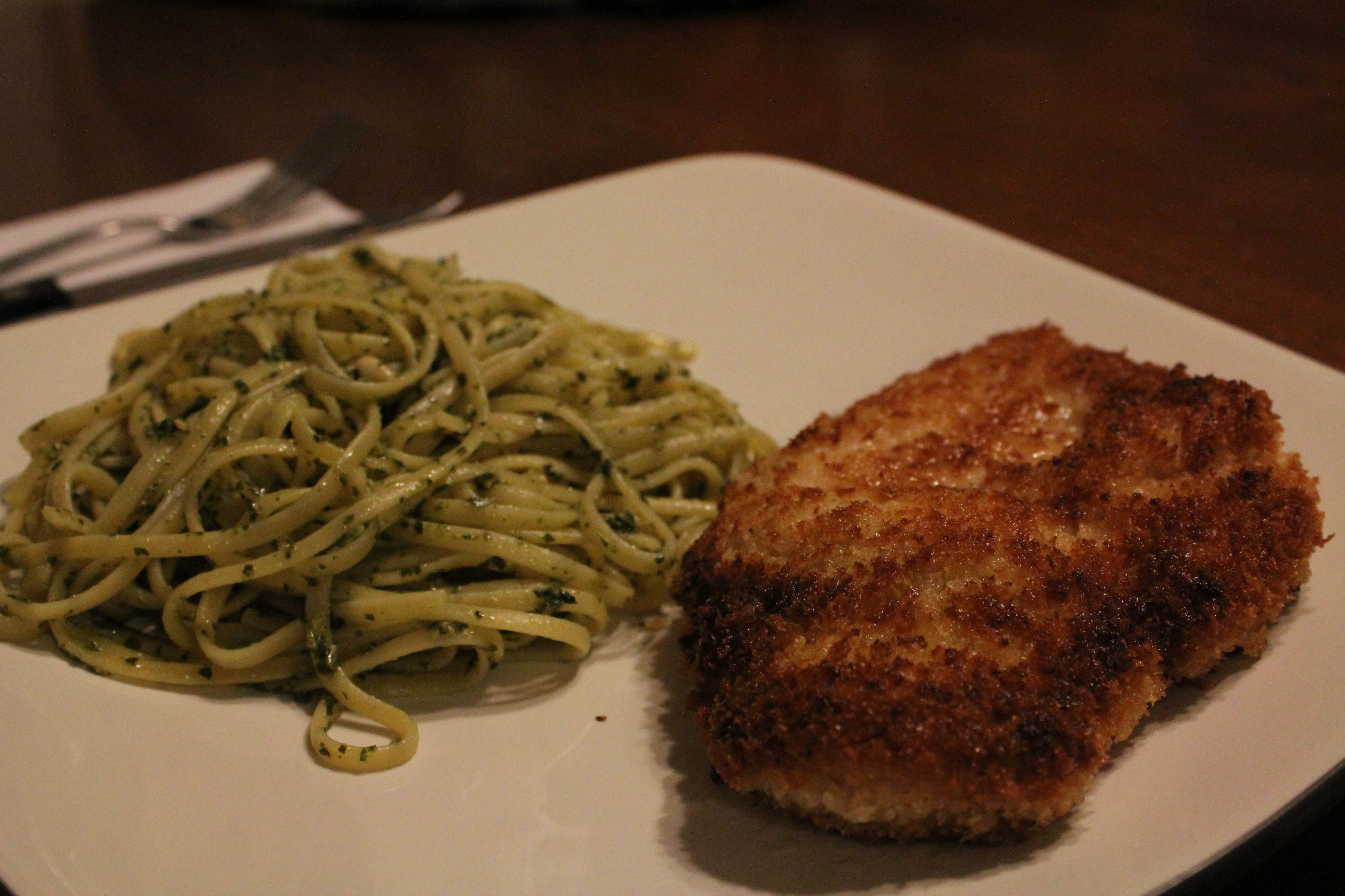Tonight I tried another Pinterest recipe. It was for a lemon pepper panko bread crumb crested chicken with pesto linguine on the side. It was delicious, although I think it needed a lot more lemon pepper than the recipe called for – that’s the one thing I would change. I only got hints of it, when I like a lot of lemony taste.