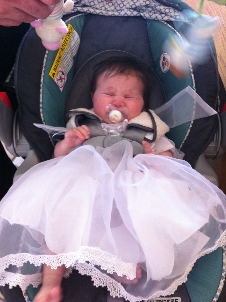 This one is of Chloe right after mass. She was not happy at all to be stuffed in her car seat and I’m sure worried that she was wrinkling her beautiful dress!