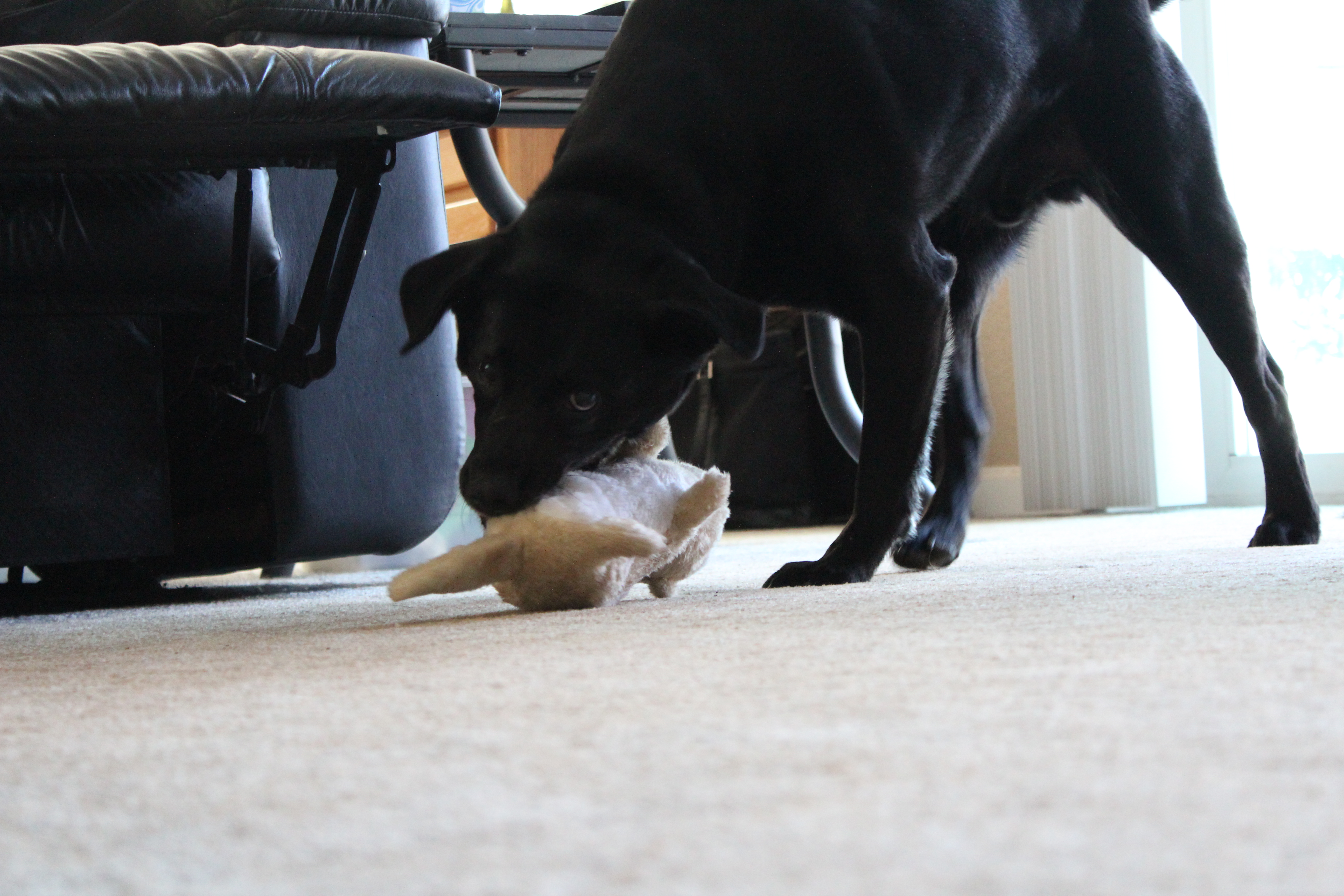 This was the longest one of these has lasted – it took about half an hour for him to get the stuffing (and squeaker) out. That really is some sort of record – normally it’s about 30 seconds before the stuffing is flying. Once all of the stuffing is out, he likes to move it around for a couple of days, tearing off a tail or an ear every now and then. He doesn’t eat any of it – just pulls and spits.