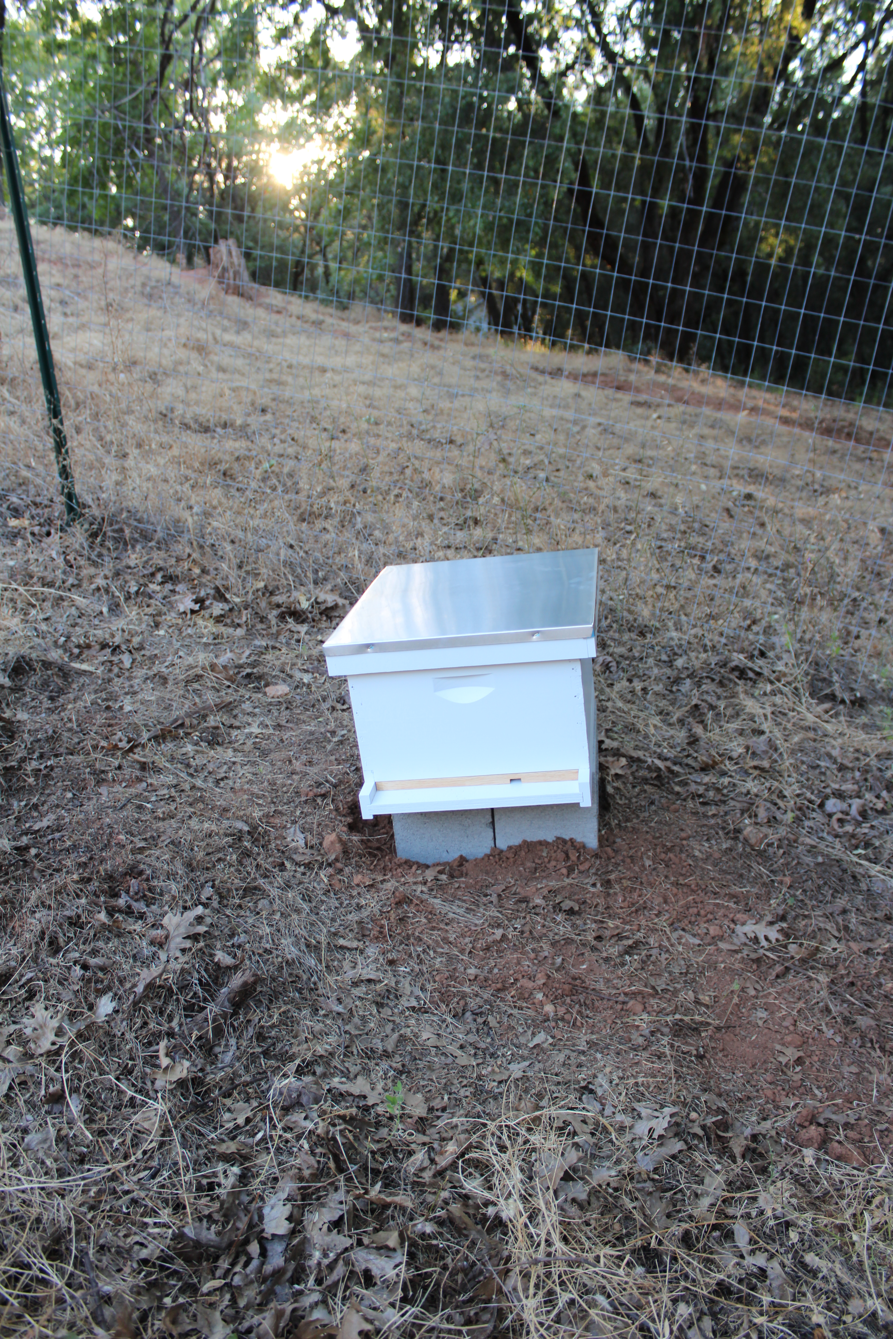 It was a little too late in the day to install them in the hive, so instead I set to getting the hive completely ready. Tomorrow is the big day! Here’s what the hive looks like in it’s permanent location: