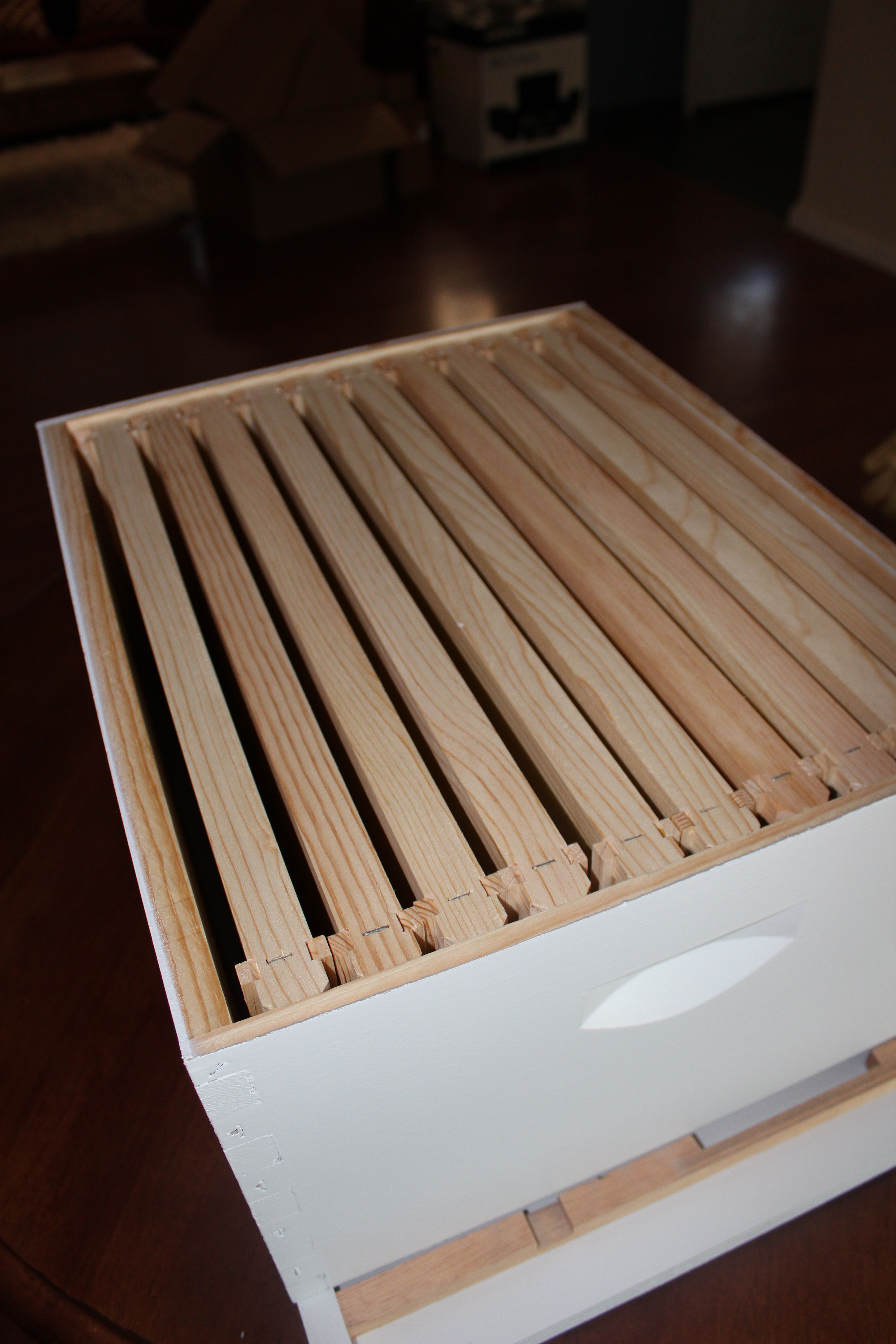 The inside is a little more complicated – this hive contains ten frames, an inner lid, and an outer lid.