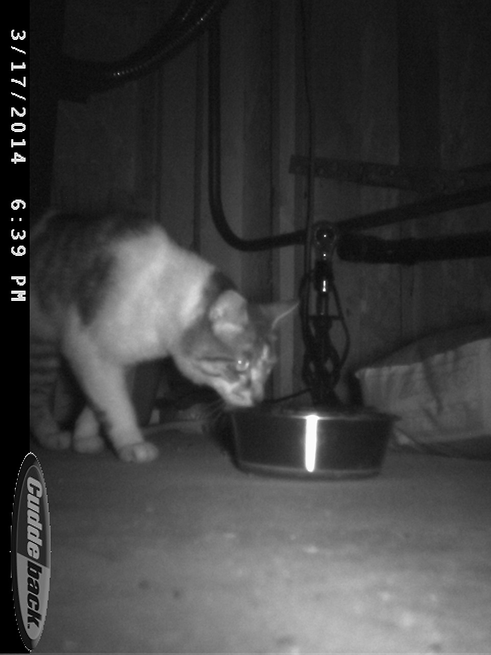 Since we let the barn cats out of their pump shed home a couple weeks ago, we have had exactly two sightings – one of Charlie down the road and one of Kenzie on the bank out front. I’ve been putting cat food out to make sure they had something to eat, but wanted to see if it was actually them coming to chow down.
