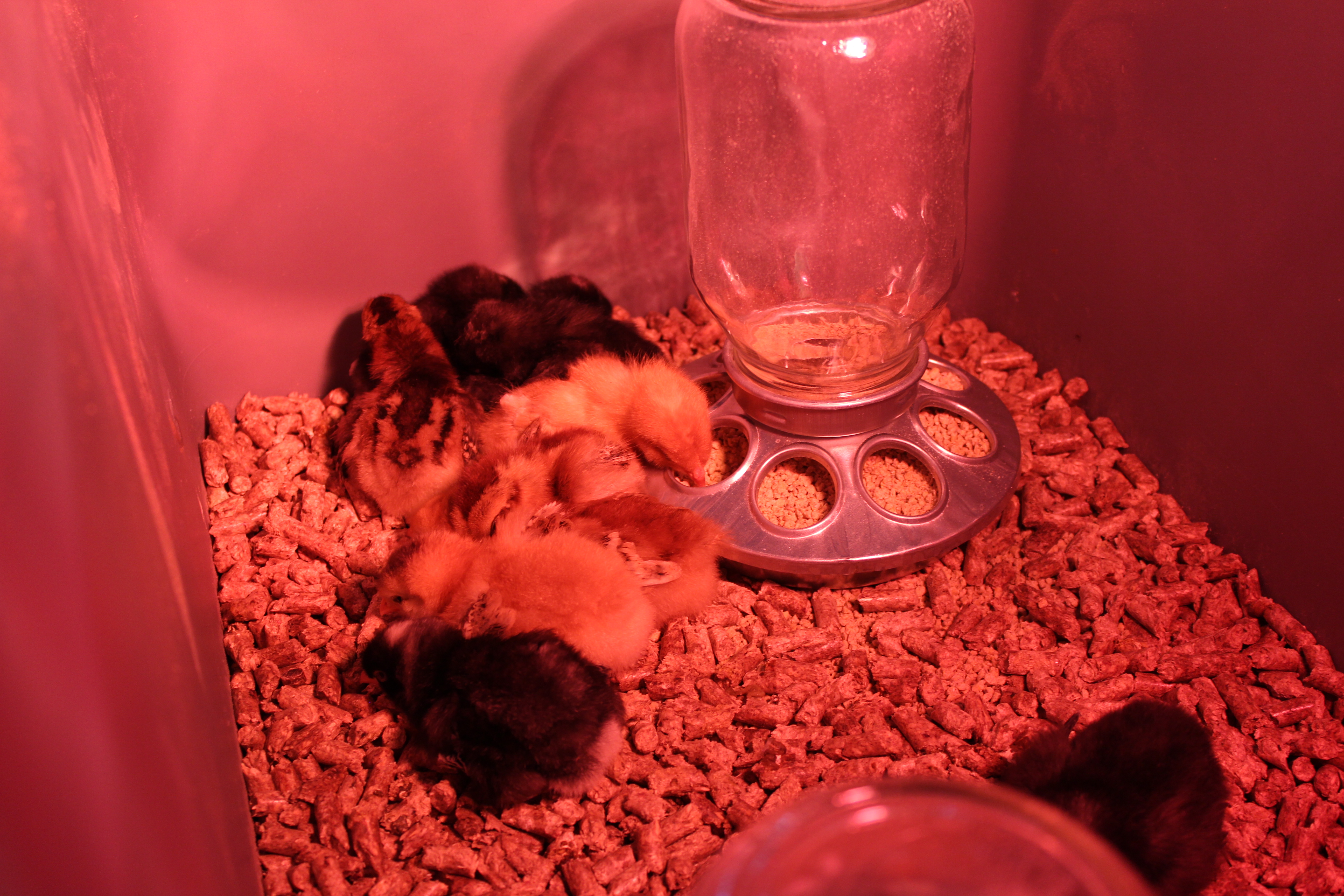 My little chicks look nothing like the pictures above. You have to use a red heat lamp because chickens are naturally cannibalistic and if for some reason one of them has any blood on it, they’ll peck it to death. The red light helps to hide anything that might trigger peckfest. That said, my garage looks like the red light district… and we have windows, so it shines outside.