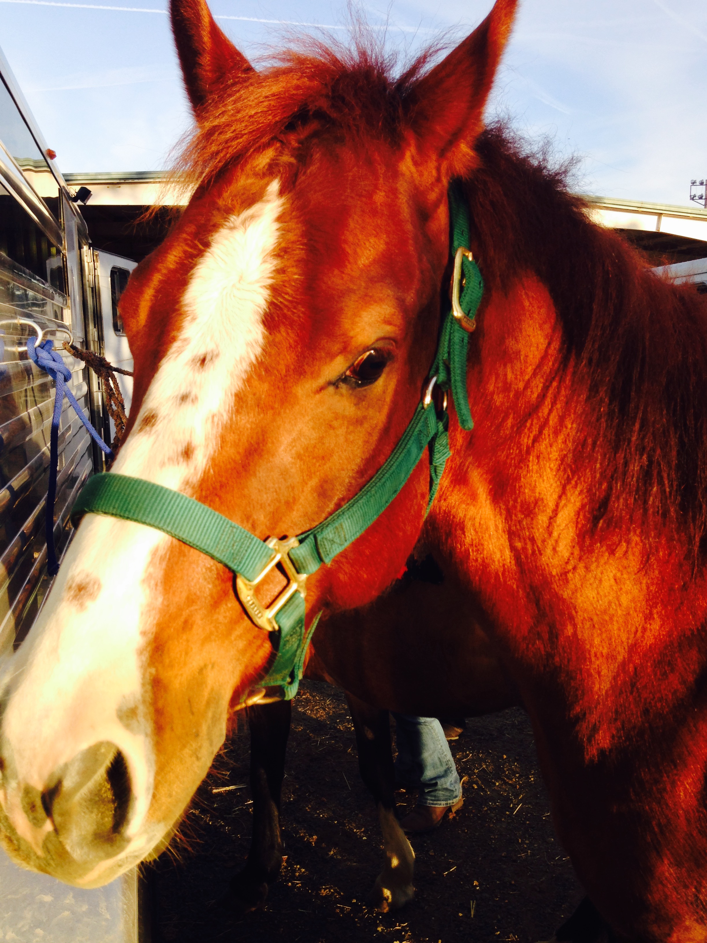 The very first thing the vet does is to tranquilize the horse… for fairly obvious reasons. Sue got pretty mellow, pretty fast. I walked him over to the trailer and we put him in the stall. He immediately leaned both on the stall and on the little chin rest.